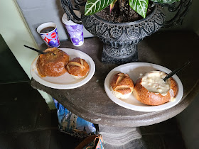 Lunch! This came care of New Orleans Square. We had some pretty tasty bread bowls. I had the New England clam chowder and Jess had the veggie stew. At first I wondered why they gave us rolls with our soup...then I realized those are the plugs that were cut out of the bowls! It made much more sense then!